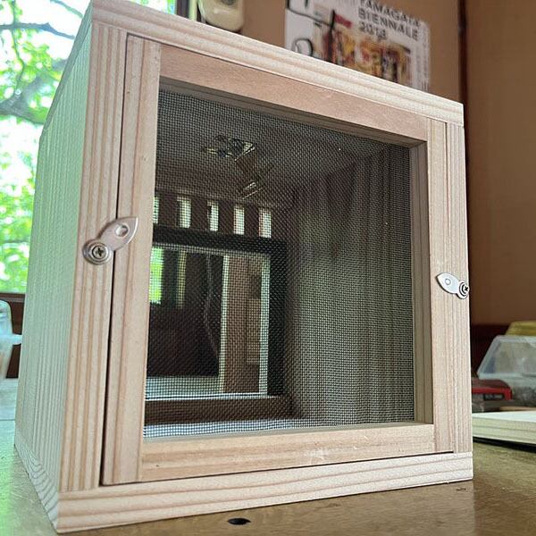 昨年、割り箸で巣を固定する方法をあらためて、プライスカードクリップを使う巣箱にリニューアルしました。割り箸式の旧巣箱を作りかえる場合はこの材料をお求めください。前後から手を入れてとめるので、後部も取り外しできるようにします。(写真参照)
